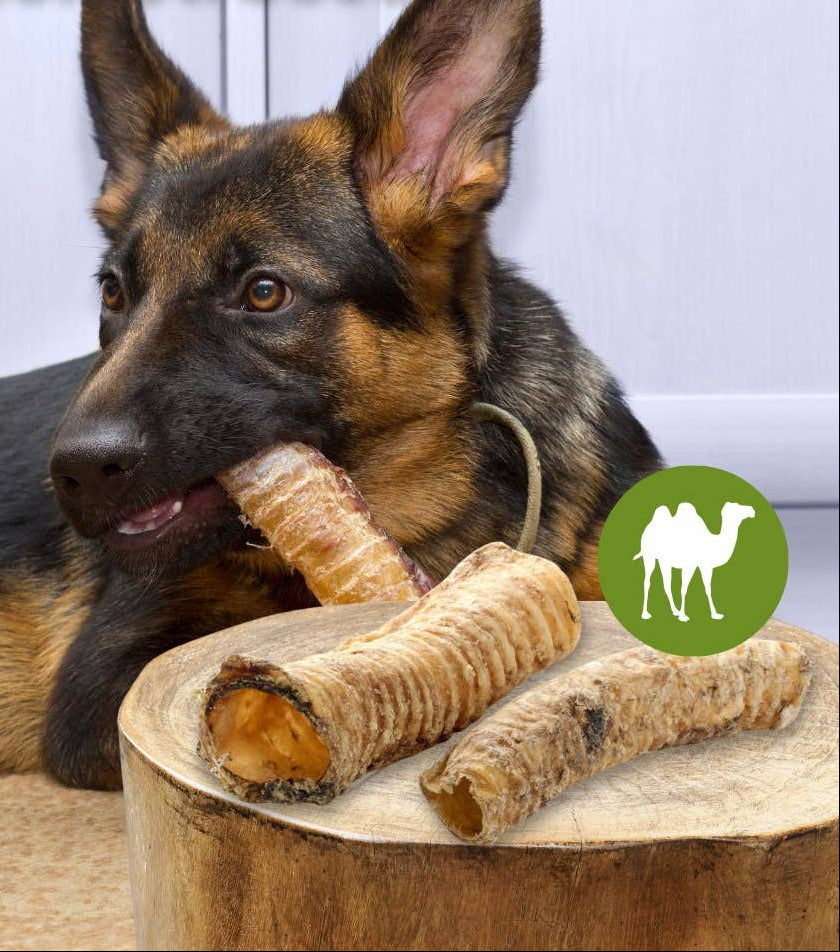 Deze kameel luchtpijp is een natuurlijke, eiwitrijke chew met een unieke structuur die zorgt voor zowel kauwplezier als tandverzorging.