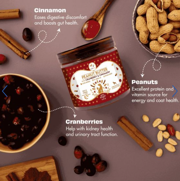Een hemelse combinatie van vers geroosterde pinda’s, zoetzure veenbessen en een vleugje kaneel – speciaal ontwikkeld voor honden! Deze romige pindakaas is 100% natuurlijk en zit boordevol gezonde voedingsstoffen die je hond van binnenuit ondersteunen.
